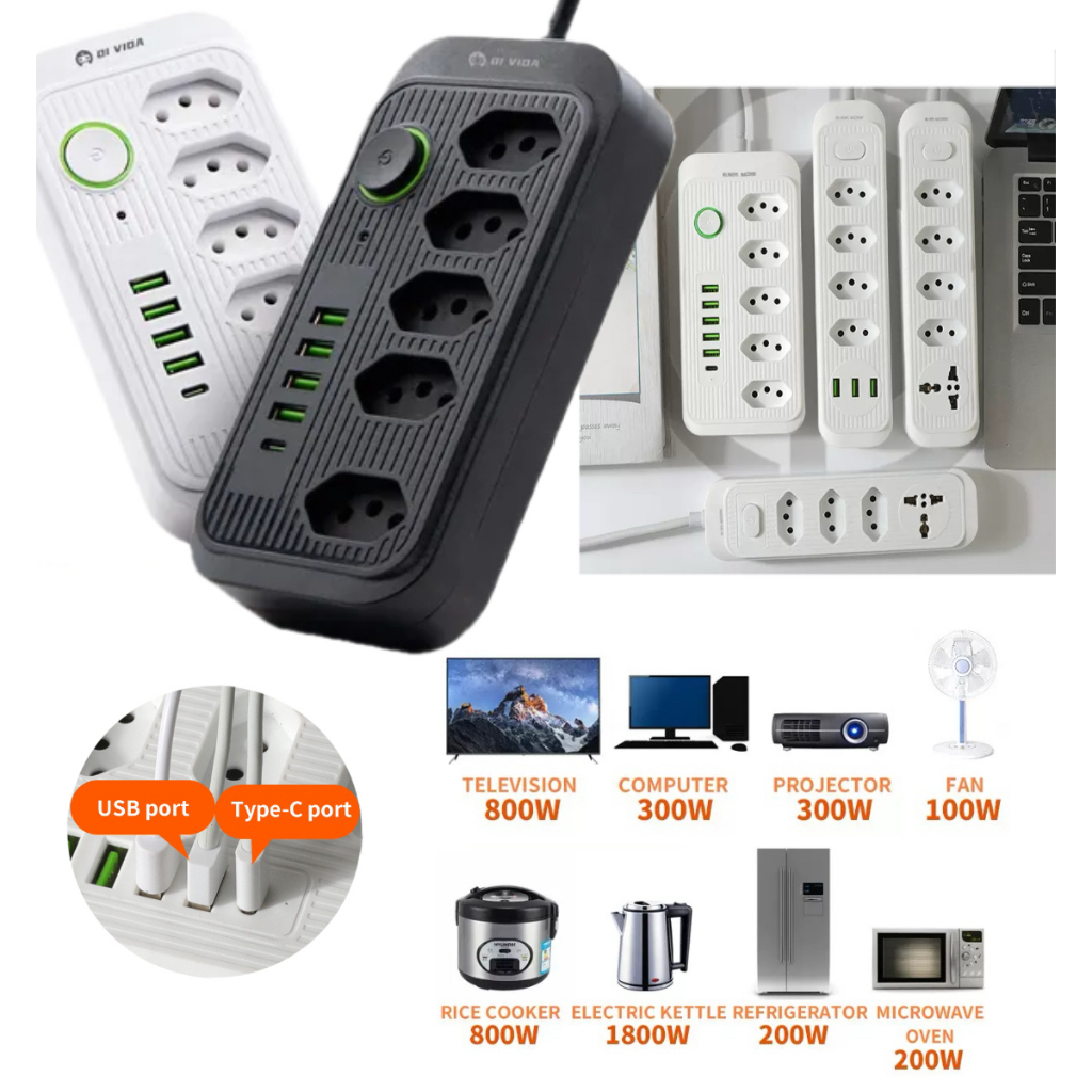 Filtro de Linha Extensão Elétrica com 3/4/5/6/8/10 Tomadas com Entrada USB e Tipo-C Régua de Energia Elétrica Bivolt