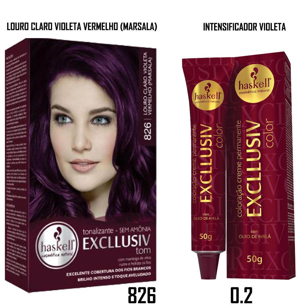Kit Haskell Tonalizante 826 Louro Claro Violeta Vermelho (Marsala) Sem Amônia + Coloração 0.2 Intensificador Violeta