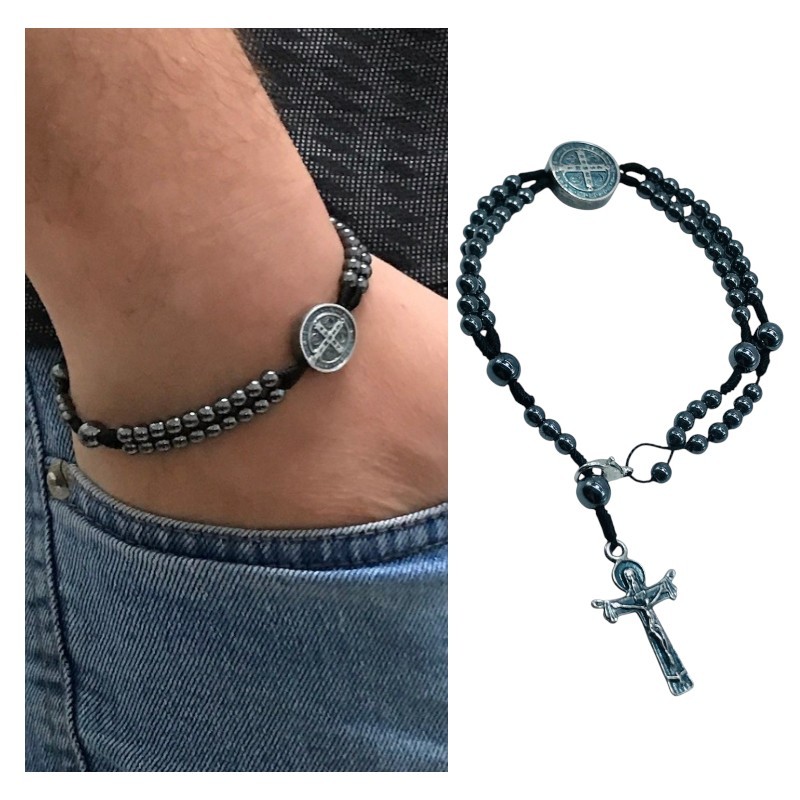 Kit 2 Pulseira Terço de Pulso Em Hematita Com Medalha de São Bento