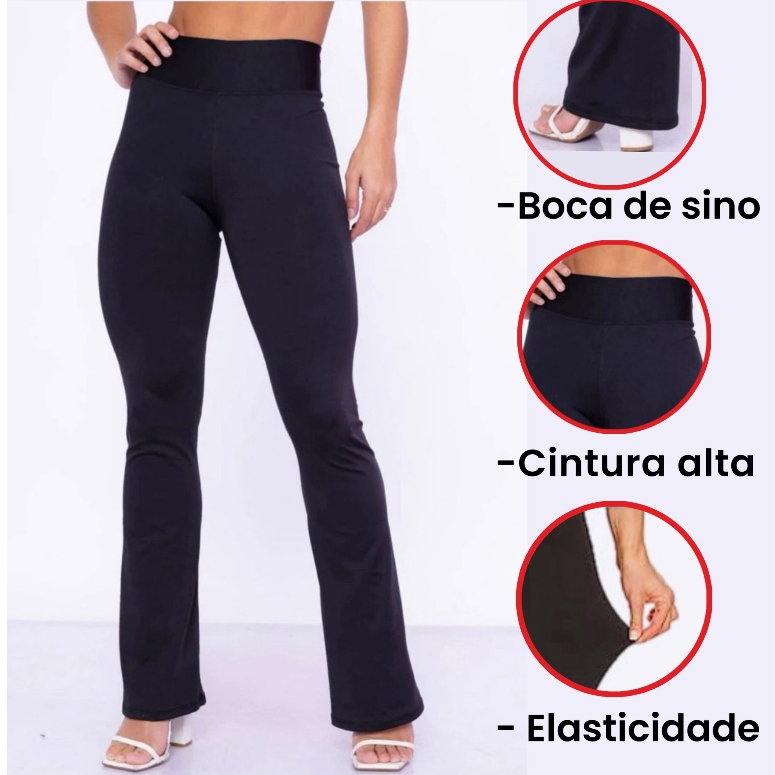 Calça Legging Flare Bailarina Boca de Sino Preta Cós Alto Zero Transparência Cintura Alta Lisa Suplex Feminina