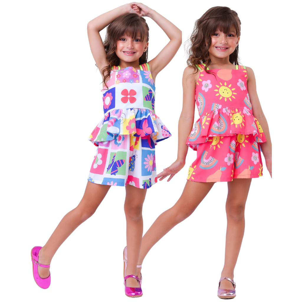 Conjunto Infantil Blusa e SHORT saia Estampa aleatoria Menina – Moda Verão Roupa Infantil Estilo Princesa Confortável