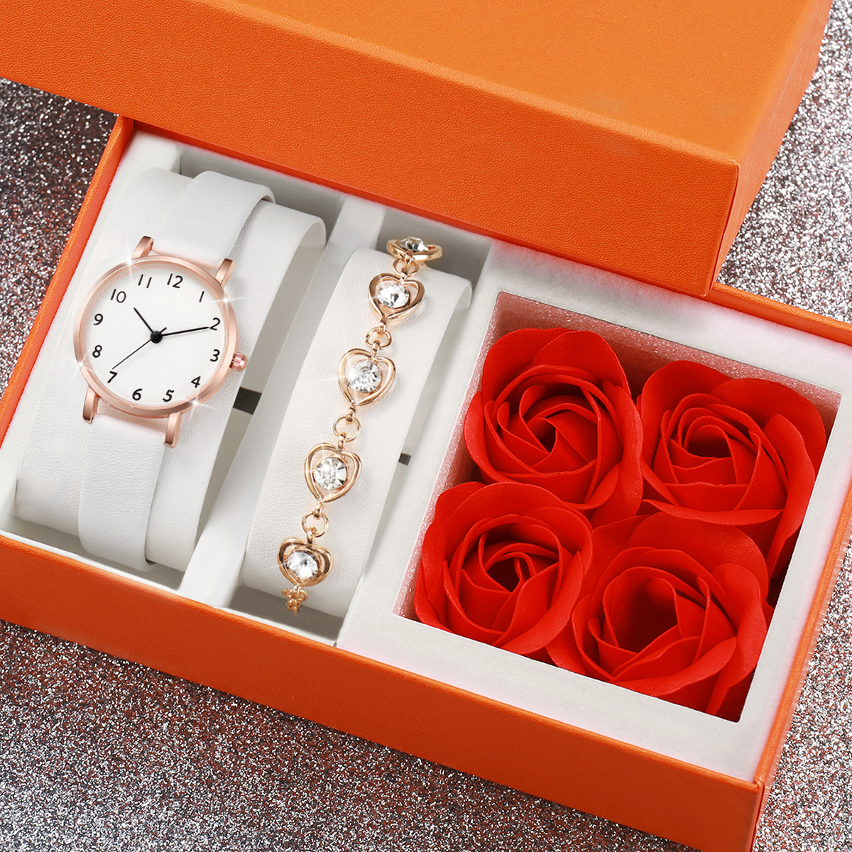 Moda Senhoras Relógio Caixa de Presente Conjunto de Caixa de Presente Casual Pequena Discagem Correia de Couro Quartzo Relógio Coração Pulseira Diamante Pulseira Dia dos Namorados