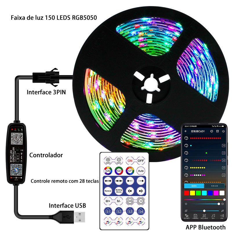Conjunto de fitas de luz WS2812 150Leds/5M Faixa de luz colorida RGB5050 Phantom Com controlador USB de 5V Lâmpadas decorativas com efeito festivo