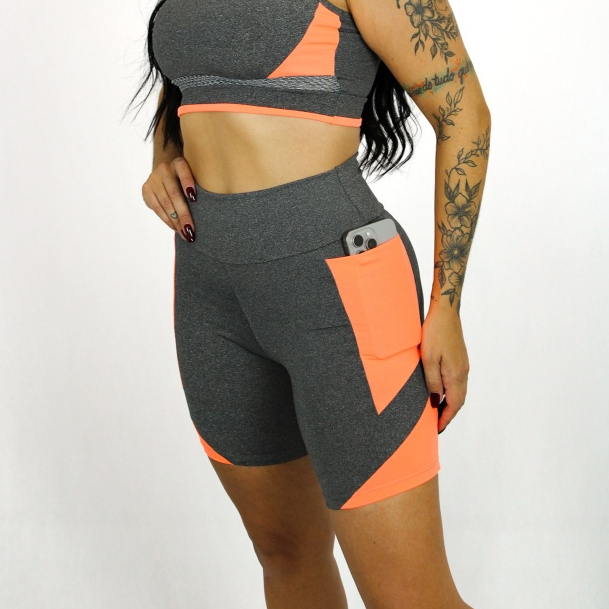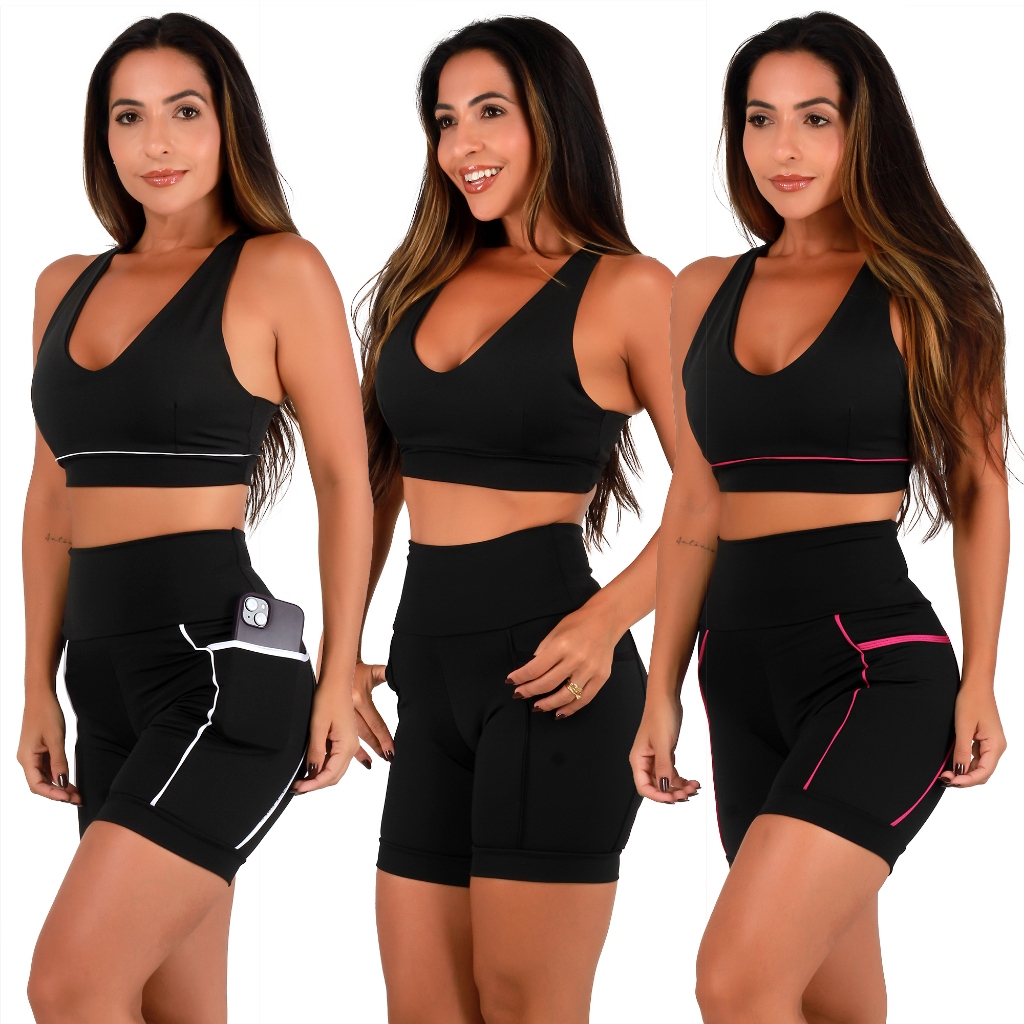 Kit 3 Conjuntos Fitness feminino Academia Top Compressão e Bermudas Com Bolsos Laterais