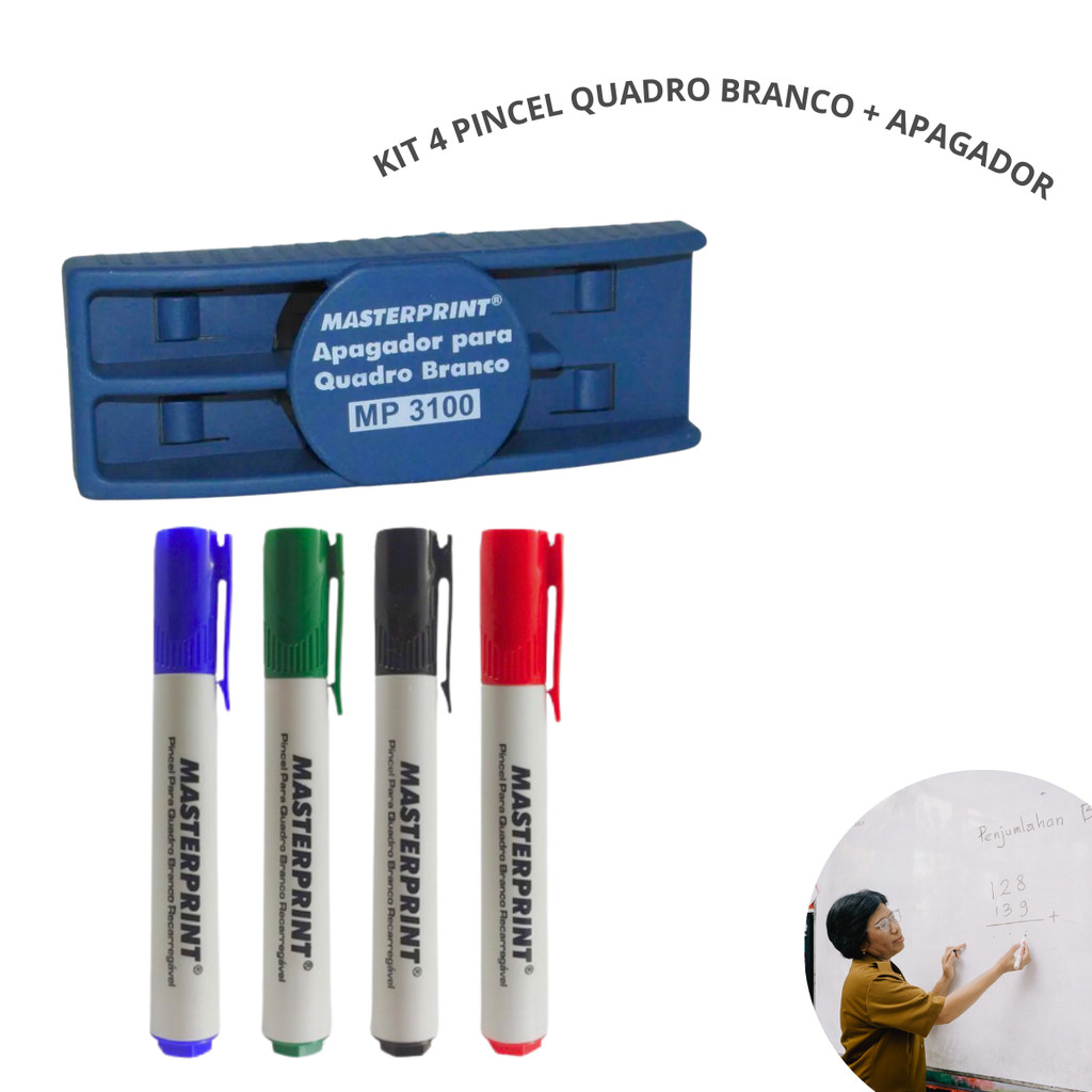 Kit Pincel Para Quadro Branco Recarregável 2 Cores Diversas e Apagador Quadro Branco Masterprint