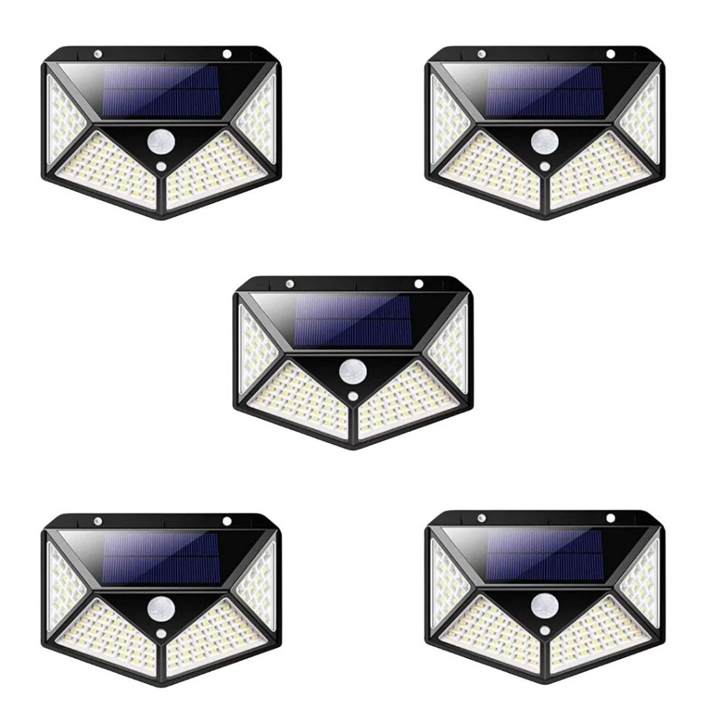 Kit 5 Luminária Solar Refletor 100 Led Com Sensor Jardim Externa Parede Prova D'água Luz Lâmpada